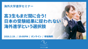 - 【2/19 (木) 19:00 開催】海外大学進学セミナー ~高3生もまだ間に合う!日本の受験結果に捉われない海外進学という選択肢~