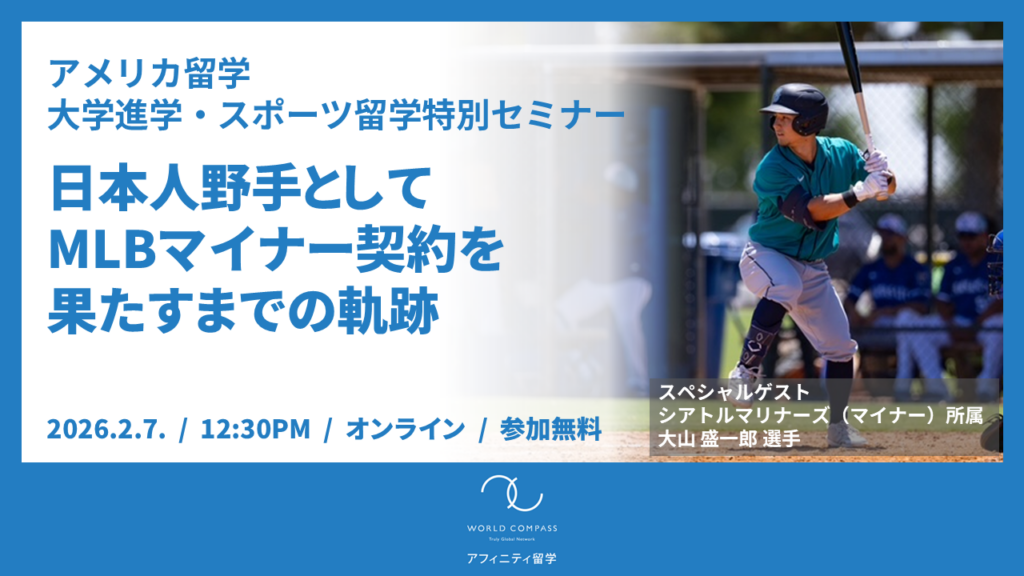 【2/7 12:30 開催】アメリカ大学・スポーツ留学特別セミナー ~挑戦の先に掴む未来:日本人野手としてMLBマイナー契約を果たすまでの軌跡~