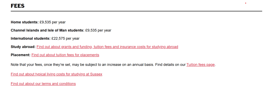 この際に見るのがInternational Studentsという部分で、国際関係・開発学を学ぶ留学生は£22,575(2025-26年度)を学費として払うということになります。