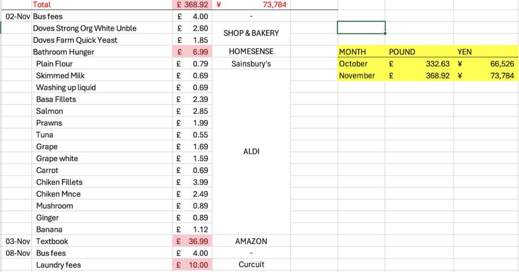 ・渡航直後・必需品購入期間:£250〜500/月(約¥50,000〜100,000)