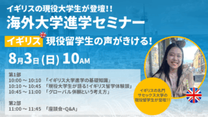 8月3日(日)10時00分~【現役イギリス大学生と考える 海外進学のリアル 対面&オンラインセミナー】参加無料