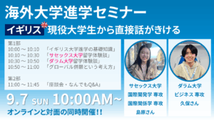 9月7日(日)10時00分~【イギリス サセックス大学&ダラム大学の現役大学生と考える 海外進学のリアル 対面&オンラインセミナー】参加無料