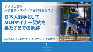 【2/7 12:30 開催】アメリカ大学・スポーツ留学特別セミナー ~挑戦の先に掴む未来:日本人野手としてMLBマイナー契約を果たすまでの軌跡~新着!!